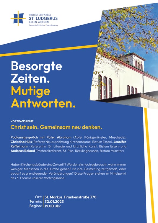 Die Zukunft der Kirchengebäude steht im Mittelpunkt des 3. Forums der Vortragsreihe "Christ sein. Gemeinsam neu denken." am Montag, 30. Januar, um 19 Uhr in der Kirche St. Markus, Frankenstraße 370.
