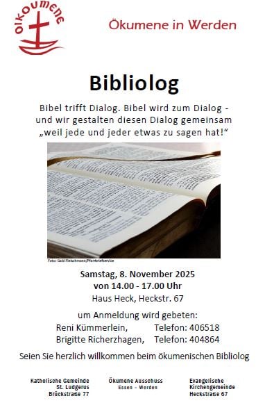 Der Ökumene Ausschuss der Werdener Gemeinden lädt am Samstag, 8. November 2025 von 14.00 – 17.00 Uhr in Haus Heck, Heckstr. 67 zum Bibliolog ein.