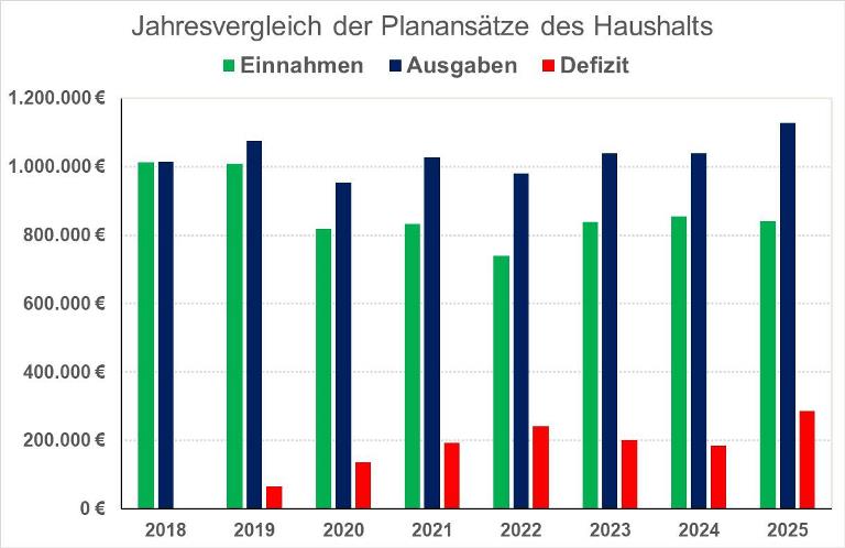 Ausgaben zu verzeichnen war. Konnte im Jahr 2018 ein fast noch ausgeglichener Haushalt aufgestellt werden, so ließ sich dies in den darauffolgenden Jahren nicht mehr realisieren. Der leichten