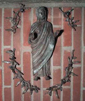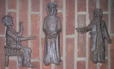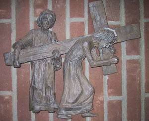 Die fünfzehn Kreuzwegstationen - 30 bis 40 cm große Tonplastiken - wurden geschaffen von Ute Hampel aus unserer Gemeinde. Der Kreuzweg wurde 1985 von Bischof Franz Hengsbach eingeweiht. Die Bistumszeitung "Ruhrwort" schrieb damals dazu: "Faszinierend ist vor allem, wie sich das Gesicht Jesu von Station zu Station verändert: Immer gequälter, verzweifelter wird sein Ausdruck, bis er am Kreuz stirbt. Doch dann plötzlich tritt etwas wie Frieden in sein Gesicht."
