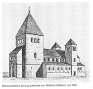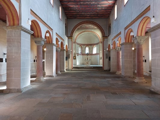 Dreischiffige, flachgedeckte Basilika mit rheinischem Stützenwechsel und Staffelchorr Baubeginn ist datiert auf das Jahr 995 und sie wurde 1063 geweiht. Sie fungierte als Filialkirche des