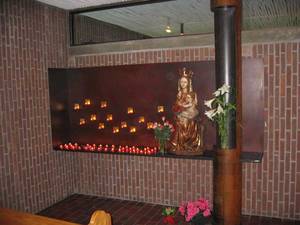 Die Gestaltung unserer Marienwand unterstreicht behutsam diese Aussagen. Sie nimmt sich zurück, Maria steht im Mittelpunkt, tritt lebendig und stärk in Erscheinung. Die große, den Raum