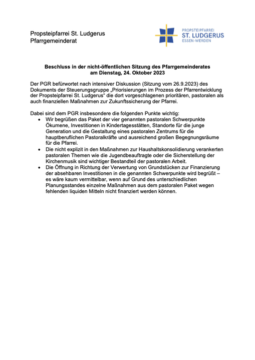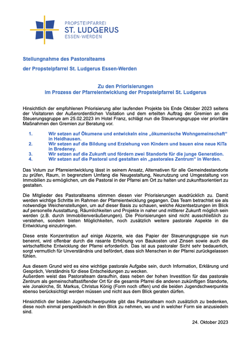 Darüber hinaus finden Sie weiter unten auch die Stellungnahmen zum Priorisierungskonzept des Pastoralteams und des Pfarrgemeinderats zum Lesen.
